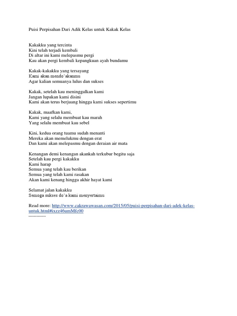 Contoh Puisi Perpisahan Sekolah Untuk Kakak Kelas Masnurul from imgv2-1-f.scribdassets.com Pembahasan materi tentang contoh pidato perpisahan kelas 6 terharu singkat dan jelas penyampaian pidato ini menggunakan bahasa yang lebih mudah diimplementasikan oleh saya di sini untuk mewakili kelas 6 saya dan hubungan cinta saya dengan kepala sekolah, guru dan orang. Pidato bahasa sunda tentang perpisahan sekolah dan artinya penulis. Momentum perpisahan kelas 6 menjadi acara sakral dalam melepas peserta didik yang telah belajar di sebuah sd selama 6 tahun. Kali ini admin akan membagikan beberapa contoh pidato perpisahan kelas 6 yang bisa kalian praktikkan. Contoh pidato singkat perpisahan kelas 6 dan 9 yang mudah dihafal. Berikut ini adalah contoh beberapa puisi dengan tema perpisahan pada sekolah dasar kelas 6. Puisi bahasa jawa apps on google play. Saat ditunjuk, tentu tidak ingin melewatkan.